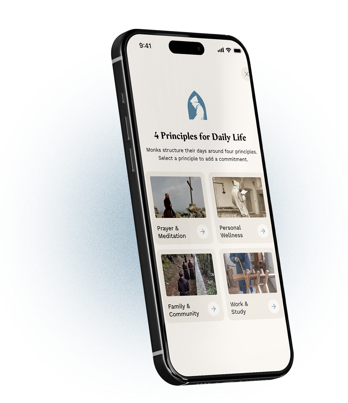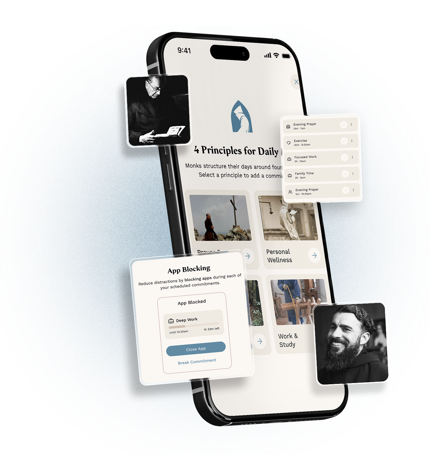 The Monk Mindset App doesn't just block your phone—it rebuilds your day with the sacred rhythms monks use for deep focus, meaningful work, and real rest.